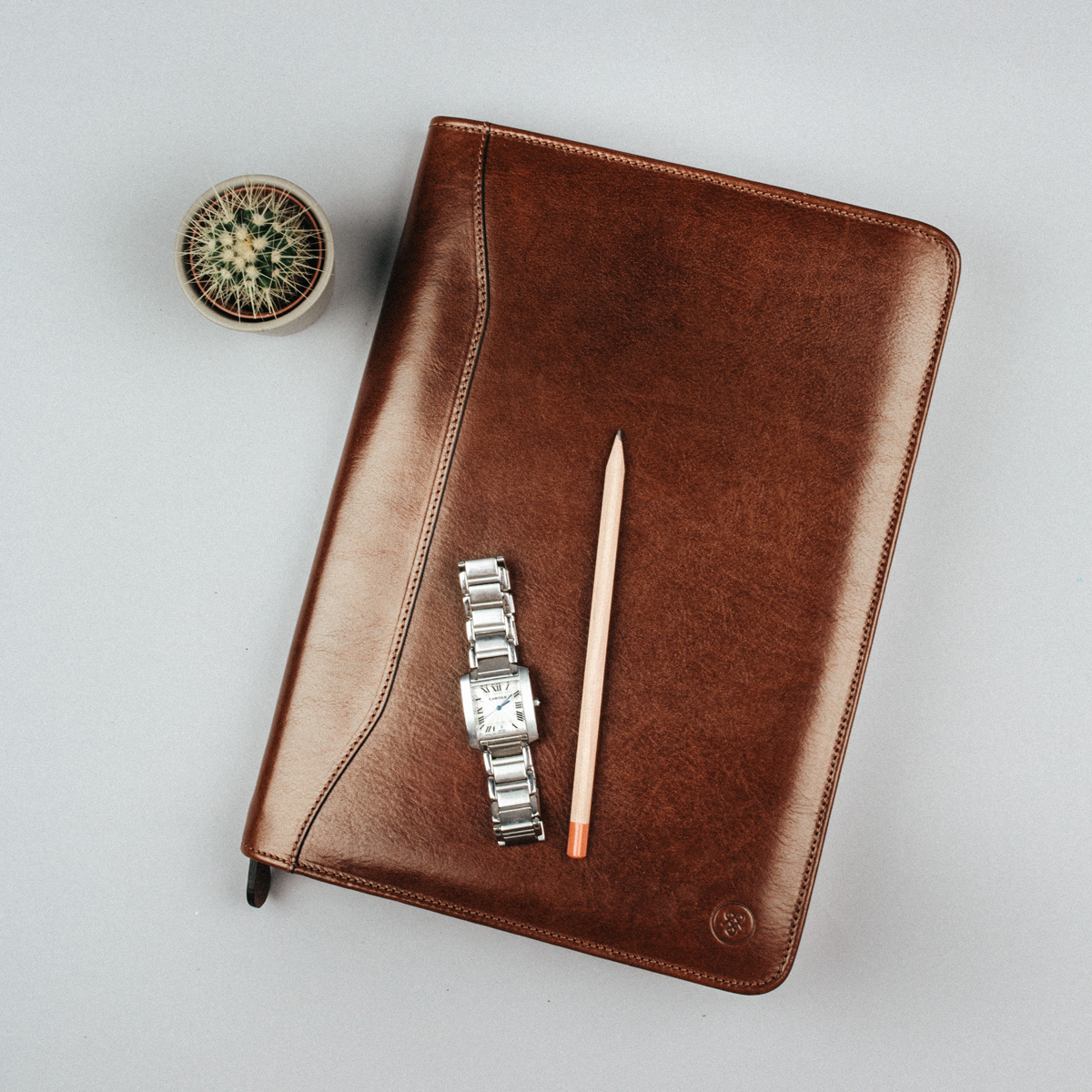 Lastly, the Dimaro document folder is a smart alternative to the Tutti. Entirely secure, there is a three-sided zip which is both practical and guarantees that all of your notes and documents will be safe. The zip opens to an A4 writing pad to the right hand side and an organiser panel for pens, an ID and business cards to the left. There is also an additional slip pocket that can accommodate a couple of sheets of A4 paper, plus a zip pocket to discreetly store smaller or folded documents. Like the Dimaro, each of these business accessories is available in three classic leathers: chestnut tan, dark chocolate brown and night black. As such, they are timeless. These are Italian leather business accessories built to last a lifetime of use.