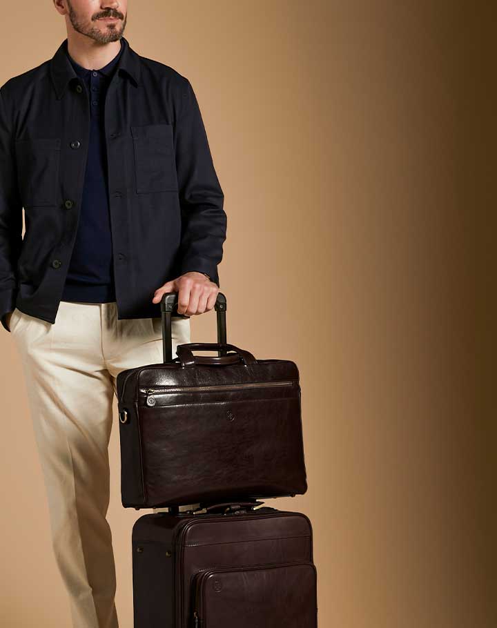 When living a Nomadic lifestyle, your laptop is precious cargo. Keep your prized possession safe and protected with The Teramo. This smart luxury leather mens briefcase is ideal for holding your laptop whilst on the move, complete with a handy sleeve to secure onto your suitcase trolley handle. Handcrafted with our unmistakable full-grain Italian leather, expect ultimate durability and a reliable YKK Excella® metal zip closure for your peace of mind.