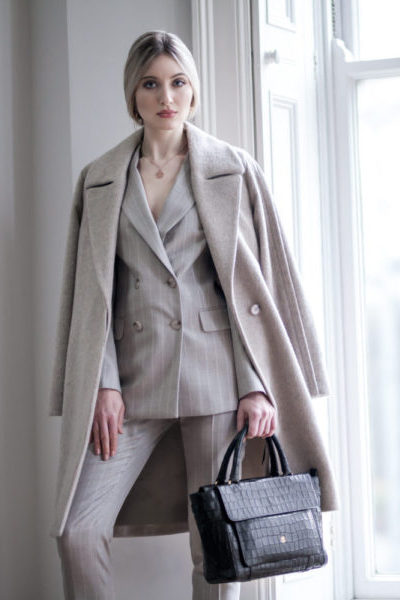 The Enrica (and Enrica Croco) is a sleek briefcase tote, designed to be paired effortlessly with professional tailored attire. It is available in two leather options – our classic faux crocodile print full grain, vegetable-tanned leather and our new pebbled leather. This pebbled leather is particularly smart with a delicate texture that is both sleek and practical. Our mock croc leather is available in classic black for formal dressing, whereas the pebbled leather is in two tones for the modern business women including a neutral taupe and classic french navy.